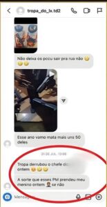 O perfil criado pelos criminosos se chamava ‘’Tropa do LX’’. Em uma das mensagens enviadas o grupo diz: “Não deixa os […] sair pra rua não. Esse ano vamos matar mais uns 50 deles”. O delegado também recebeu um vídeo de vários homens segurando armas.