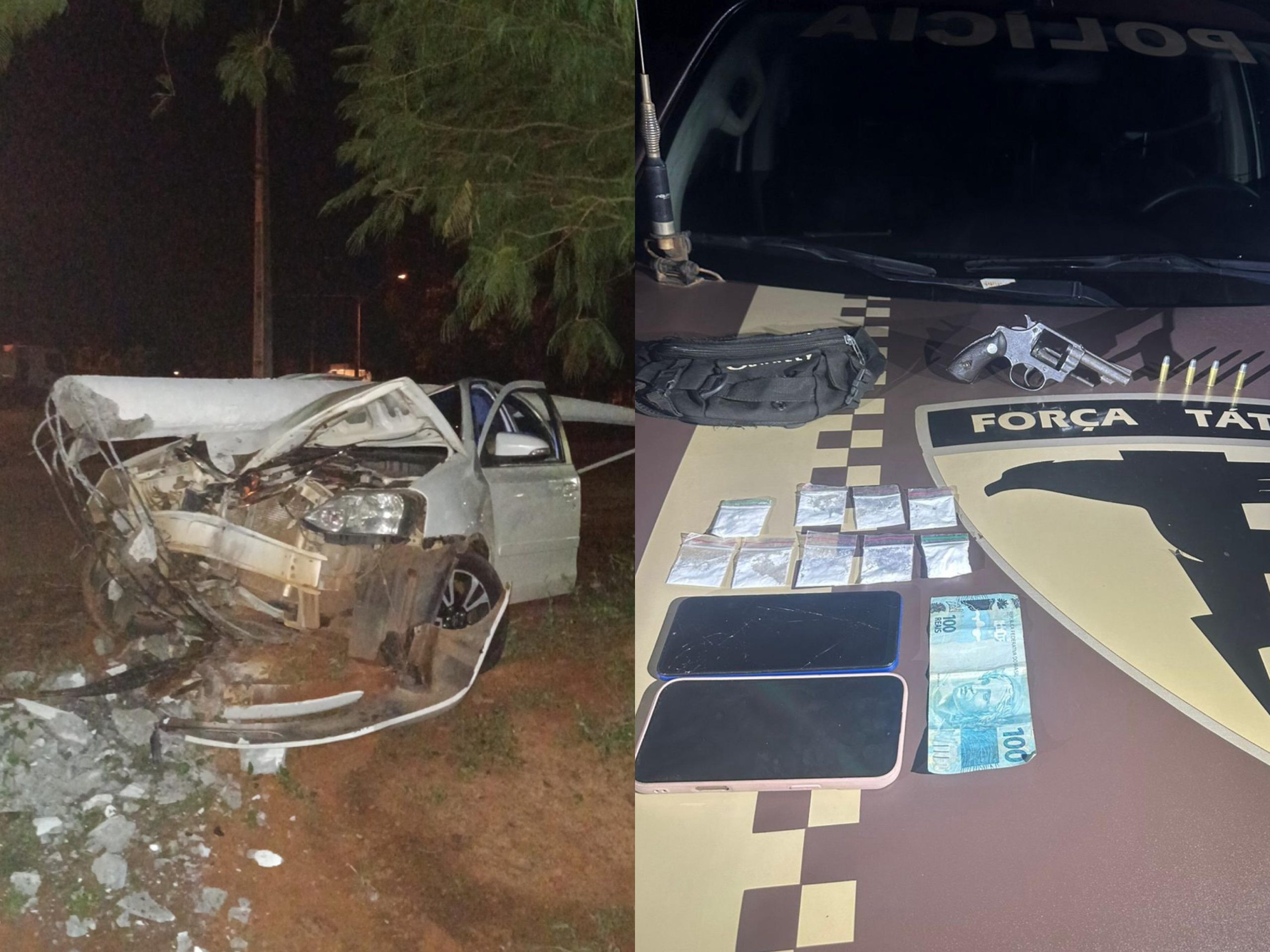 Uma ação da Força Tática (FT) do 1º Batalhão de Polícia Militar (1º BPM) resultou na prisão de um homem, de 20 anos, e uma mulher, de 19 anos, pelos crimes de porte ilegal de arma de fogo de uso permitido e tráfico de drogas, na madrugada desta sábado, 10, em Palmas. Os suspeitos fugiram da abordagem policial, realizaram manobras perigosas e acabaram batendo o carro contra um poste.